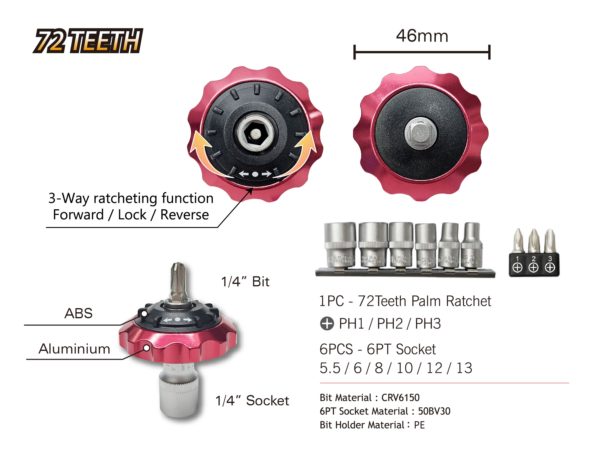 1 Pc- 46mm 72 Teeth Double-End Aluminium Handle With 3-Way